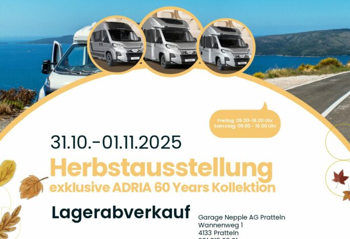 60 Jahre Adria Wohnmobile – Jubiläumsausstellung vom 31. Oktober bis 1. November 2025 Wann? 31. Oktober bis 1. November 2025 Freitag: von 09.00 – 18.00 Uhr Samstag: von 09.00 – 16.00 Uhr Wo? Garage Nepple AG Pratteln, Wannenweg 1, 4133 Pratteln Lassen Sie sich dieses Event nicht entgehen! Wir freuen uns auf Sie!